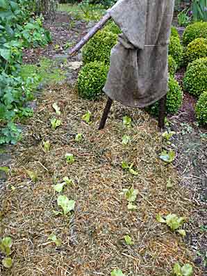 Plantation de batavias pour remplacer celles qui n’ont pas résisté à la voracité des limaces. Cette photo est prise alors que la plate-bande est encore présentable : au sol de la fougère broyée qui, théoriquement est efficace contre les escargots. Ce qui ne m’empêche pas de mettre du ferramol, ce que je n’avais pas fait la 1ère fois... on voit ce que çà a donné comme résultat. (L’épouvantail surveille la plate-bande ! je comptais sur lui pour m’avertir de l’arrivée des gastéropodes. C’est raté !)