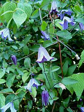 Découverte d’une autre clématite. Et de surcroît, en fleurs ! C’est ’Blue Boy’, un hybride de viticella, ce qui explique ses nombreuses petites fleurs en clochettes. Elle part à l’assaut du Viburnum plicatum ’Shasta’
