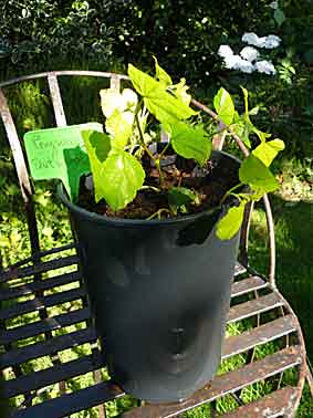 Je fais des boutures... au cas où ! Notez que le conteneur est plus profond que large (c’est un pot à clématite) et que j’y mets 5 ou 6 boutures. Il est placé à l’ombre d’un arbre (le laurier-sauce du voisin !) dans un coin du potager.