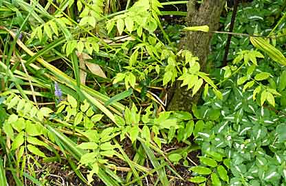 Dans cette plate-bande il y a un bambou qui est une merveille (feuillage jaune, hauteur 1 m). C’est de loin mon bambou préféré : Pleioblastus auricoma. Mais il est beaucoup plus traçant que prévu. Il est en train de coloniser la plate-bande. Je récupère des rejets (ils sont les pieds dans un seau d’eau mais je vais certainement, demain, les planter en attente dans un pot). De toute façon, l’hiver prochain il va falloir lui mettre une "barrière".